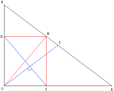 1. Hauteur et médiane d'un triangle rectangle![]() Le triangle OAB est rectangle en O. (OI) est la médiane et (OH) la hauteur issues de O. Le point H se projette orthogonalement en J et K sur les petits côtés du triangle. Montrer que les droites (OI) et (JK) sont orthogonales.