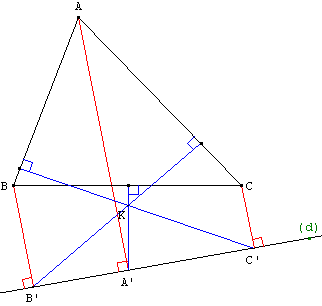 6. Un curieux point de concours![]() On projette orthogonalement les sommets d'un triangle ABC sur une droite d en A’, B’ et C’. Soit d1 la droite passant par A’ perpendiculaire à (BC), Montrer que les droites d1, d2 et d3 sont concourantes. Méthode à mettre en œuvre Les droites d2 et d3 sont concourantes en K. Montrer que le produit scalaire des vecteurs