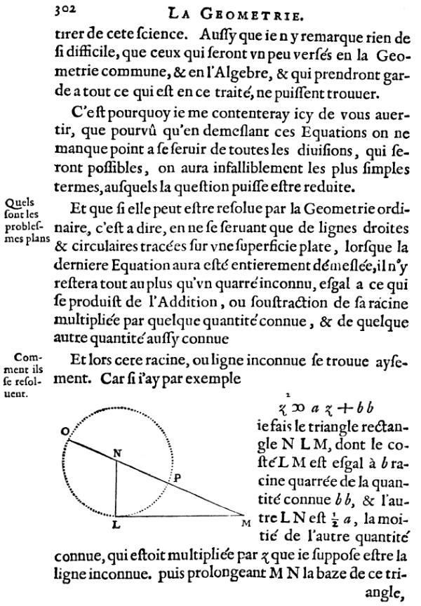 La Géométrie - Problèmes plans - Page 302![]() tirer de cette science. Son dessein est que ses ennemis (comme Roberval) ne puissent pas profiter de ses explications : Aussi que je n'y remarque rien de si difficile que ceux qui seront un peu versés en la Géométrie commune et en l'algèbre, ait qui prendront garde à tout ce qui est en ce traité, ne puissent trouver. Dans sa lettre à Mersenne du 20 avril 1646, Descartes se justifie : « Seulement y ai-je omis (dans La Géométrie) quantité de choses, qui auraient pu servir à la rendre plus claire, ce que j'ai fait à dessein, et je ne voudrais pas y avoir manqué. » C'est pourquoi je me contenterai ici de vous avertir que, pourvu qu'en démêlant ces équations, on ne manque point à se servir de toutes les divisions qui seront possibles, on aura infailliblement les plus simples termes auxquels la question puisse être réduite. Quels sont les problèmes plansEt que si elle peut être résolue par la Géométrie ordinaire, c'est-à-dire en ne se servant que de lignes droites et circulaires tracées sur une superficie plate, lorsque la dernière équation aura été entièrement démêlée, il n'y restera tout au plus qu'un carré inconnu, égal à ce qui se produit de l'addition ou soustraction de sa racine multipliée par quelque quantité connue, et de quelque autre quantité aussi connue. Les problèmes plans sont ceux qui se ramènent à la résolution d'une équation du deuxième degré, Comment ils se résolventEt lors cette racine, ou ligne inconnue, se trouve aisément. Équation z2 = a z + b2Cas où l'équation du second degré n’a qu'une racine positive, car Descartes ignore les nombres négatifs. La justification repose sur la notion de puissance du point M par rapport au cercle. Car si j'ai par exemple z2 = az + b2, je fais le triangle rectangle NLM, dont le côté LM est égal à b, racine carrée de la quantité connue b2, et l'autre LN est Page 303 (ci-dessous) jusqu'à O, en sorte qu'NO soit égale à NL, la toute OM est z, la ligne cherchée. .