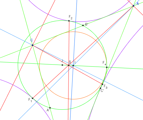 et les trois cercles exinscrits s'appellent les points de Feuerbach du triangle.