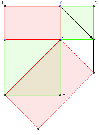 Duplication du rectangle![]() Tracer, le long du rectangle ABCD, deux carrés ayant pour côtés les longueur et largeur. Le rectangle JIBF, ayant pour côtés les diagonales des carrés, a une aire double de celle de ABCD.