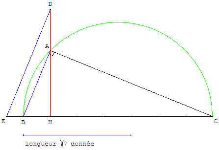 5. Racine de septÉtant donné une longueur-unité, comment construire à l'aide d'une règle et d'un compas, un segment de longueur Moyenne géométrique : construction d'Euclide reprise par Descartes M:A.T.H. : Mathématiques Approchées par des Textes Historiques À partir d'une unité a, construire le segment [BC] de longueur 7a et le point H à l'intérieur tel que BH = a. Tracer un demi-cercle de diamètre [BC]. Réciproque Pour retrouver l'unité à partir d'une longueur